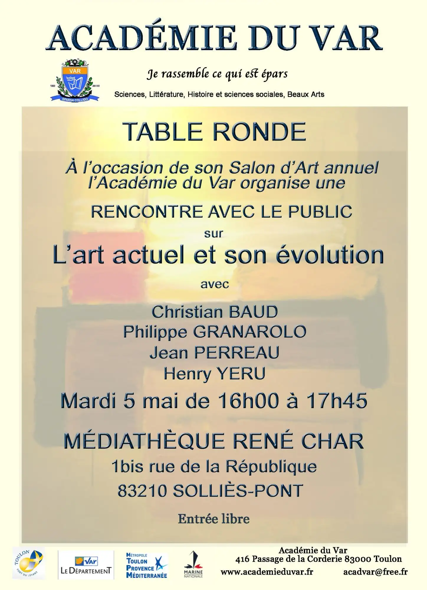Le cœur de notre logo (sa symbolique du livre ouvert associée au profil d'une lectrice) a retrouvé son fond bleu azur, logé au centre d'un écu accueillant VAR dans le tiers supérieur orangé, et pour recomposer notre blason parfaitement ré-assemblé et bien stabilisé sur une ancre de marine, s’y ajoutent de part et d'autre de la pointe de l'écu les rameaux de laurier et de chêne, symboles de distinction visant l’excellence et la pérennité, en haut de l'ancre quelques sarments de vigne, enfin en bas de l'ancre le ruban bleu portant notre devise « sparsa colligo ».